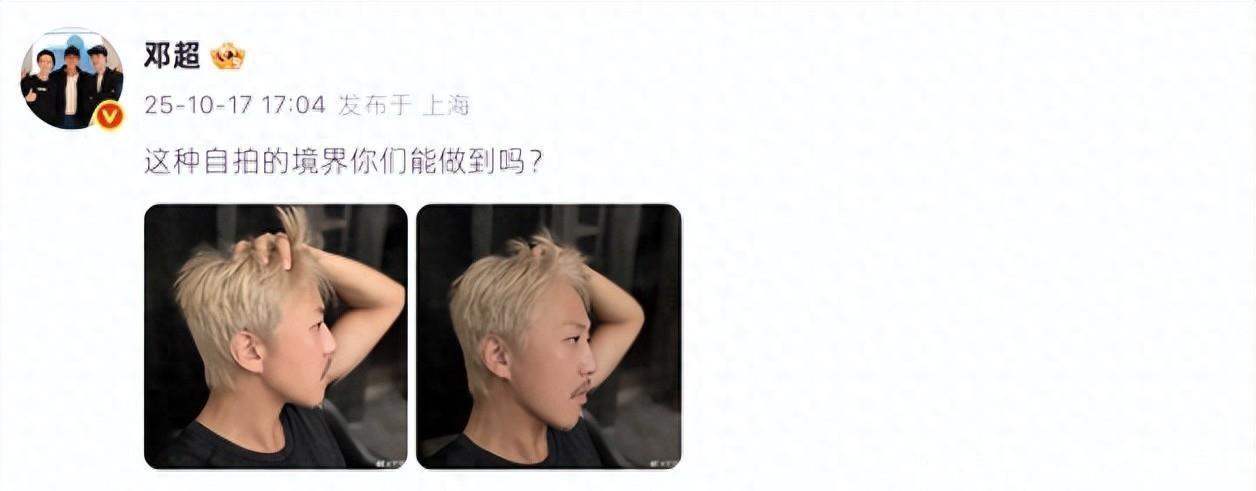 当明星以一头黄发亮相时,总能引发众多网友的热议,这是对公众审美的大胆挑战,但这种挑战是否明星个人的风格,他们本身也要斟酌考量,不能仅靠简单的外形改变,来衬托起自身无法驾驭的气质。近日,邓超就在自己的社交平台分享了自己的一组黄发造型,并配文说:“这种自拍的境界你们能做到吗?”虽然他说的是自己的拍照技术,但想炫耀的是他的一头金发。
